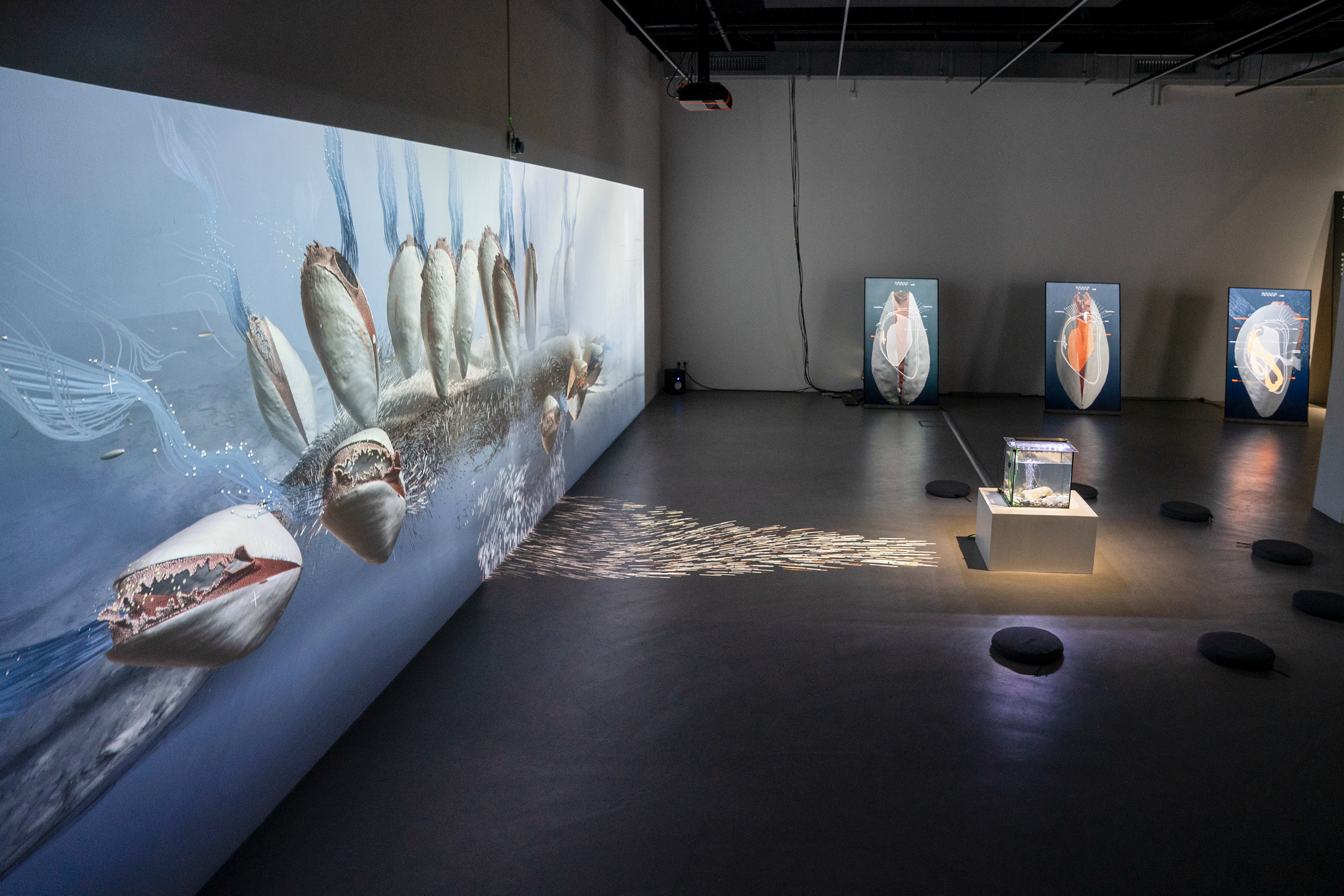 Der Herzschlag von Miesmuscheln steht im Mittelpunkt einer narrativen multimedialen Raumerfahrung. Ihre damit sichtbare und spürbare Lebensaktivität stellt unser Verältnis zu nicht-menschlichen, fremdartigen Lebensformen in Frage. Die interaktive Projektion schafft eine berührbare Schnittstelle zwischen dem ungestörten Organismus und dem Menschen, der direkte Konsequenzen seines Handelns erfährt und über die Bedürfnisse von Muscheln und ihre Rolle im Ökosystem informiert wird.